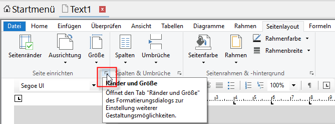 Die Einstellungen für das Seitenlayout eines Dokumentes können auch über den Dialog Seite einrichten vorgenommen werden. Für das Öffnen des Dialogs gibt es mehrere Möglichkeiten.