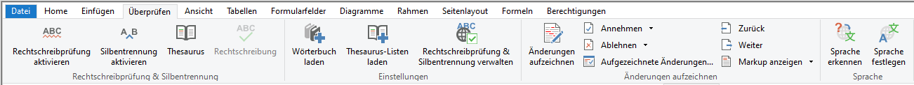 In dem Register Überprüfen sind alle Funktionen und Einstellungsmöglichkeiten für die Rechtschreibprüfung und um Änderungen von Dokumenten nach zu verfolgen.