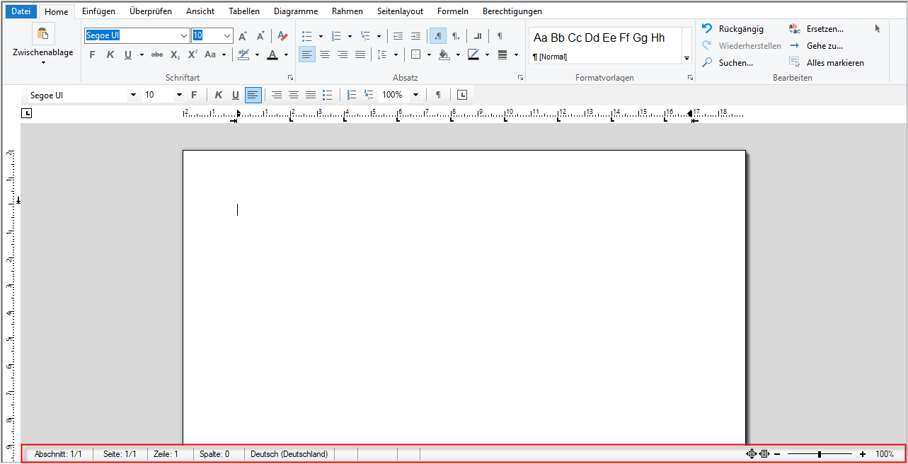 Am unteren Rand des Anwendungsfensters sehen Sie die Statusleiste. Wie der Name schon sagt, gibt sie Ihnen Informationen zum aktuellen Dokument sowie den Zoom-Regler.